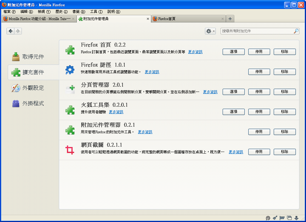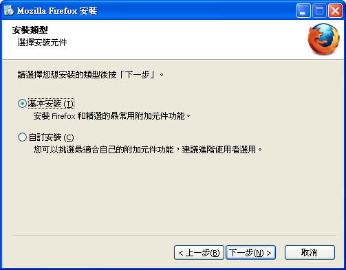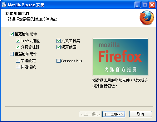Firefox 台灣版分成基本安裝及自訂安裝兩種安裝模式,選擇基本安裝時,會自動安裝 Firefox 捷徑、火狐工具集、分頁管理器、網頁截圖等四個套件;自訂安裝時,則可從七個擴充套件中任選。不論基本安裝或自訂安裝中如何選擇,都一定會裝上 Firefox 首頁 及 附加元件管理器 兩套件。